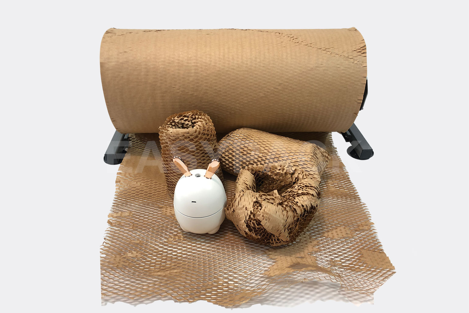 3D六角蜂窩狀的牛皮紙卷,經過拉伸后呈現(xiàn)立體蜂窩結構的紙襯墊,在包裹物品后能產生良好的緩沖防震效果。